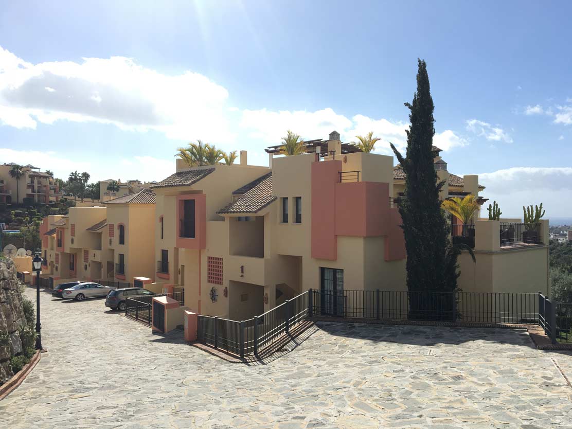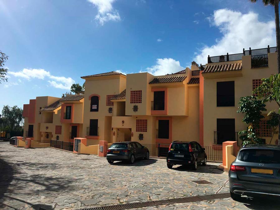 Para los trabajos realizados en los 24 bloques que conforman las dos fases de la C. P. La Finca, en urb. Los Arqueros, utilizamos plataformas elevadoras en las fachadas laterales y escaleras telescópicas para acceder a las terrazas. El trabajo se prolongó durante 10 meses, comprendiendo el rellenado de juntas de dilatación y el repintado de muros y fachadas de edificio, cerrajería metálica y pérgolas.